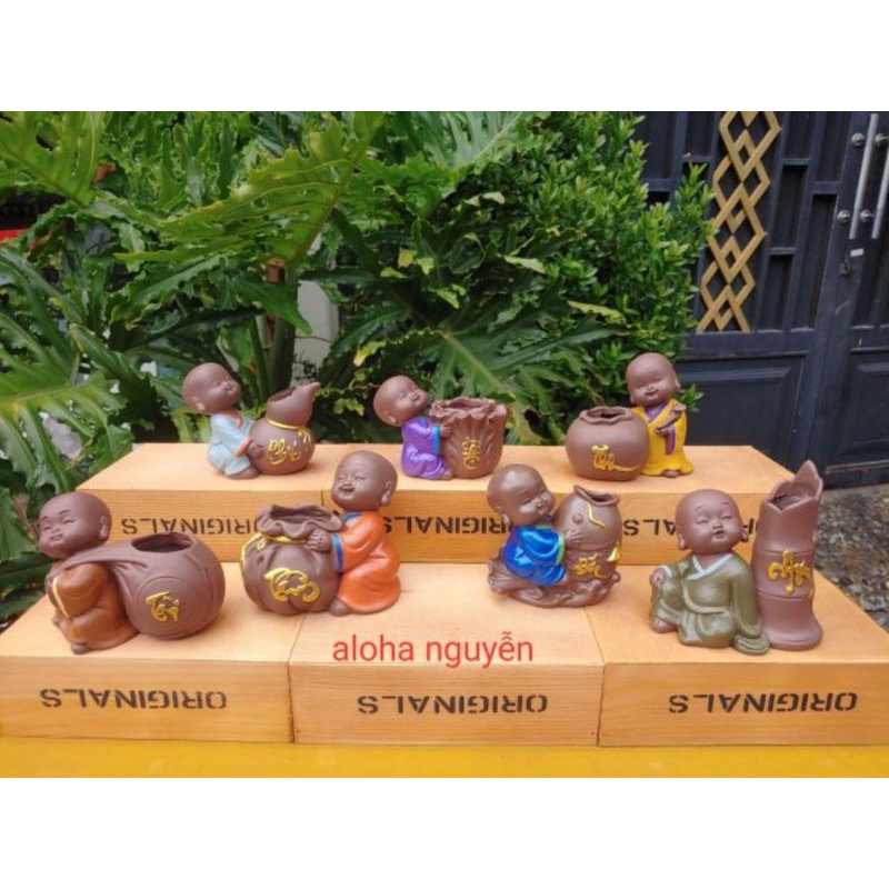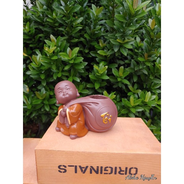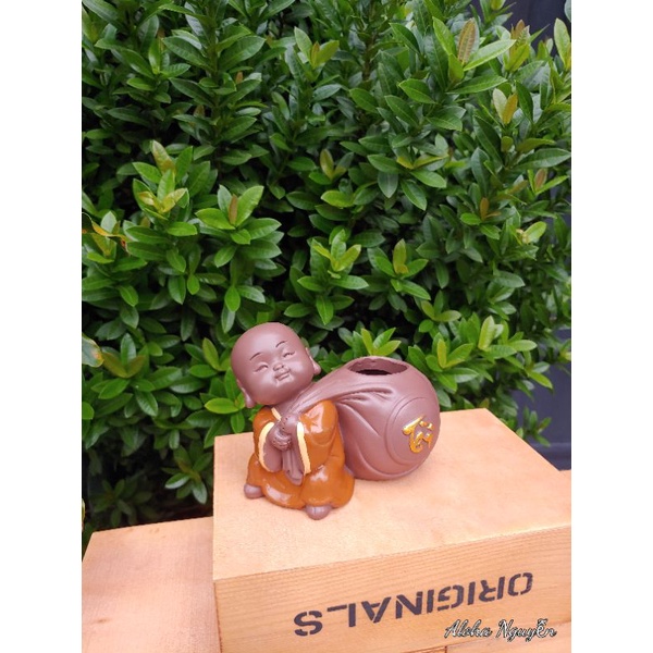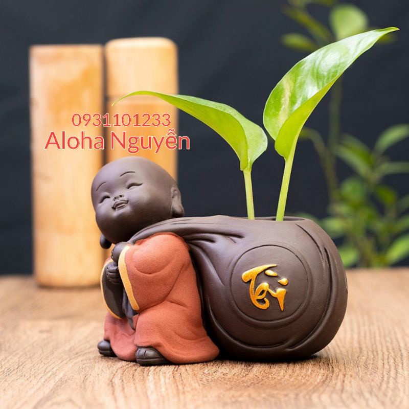 Chậu trồng cây để bàn hình chú tiểu dùng để trồng sen đá và các cây nhỏ. minichậu chú tiểu trồng cây chữ tài ôm túi vàng