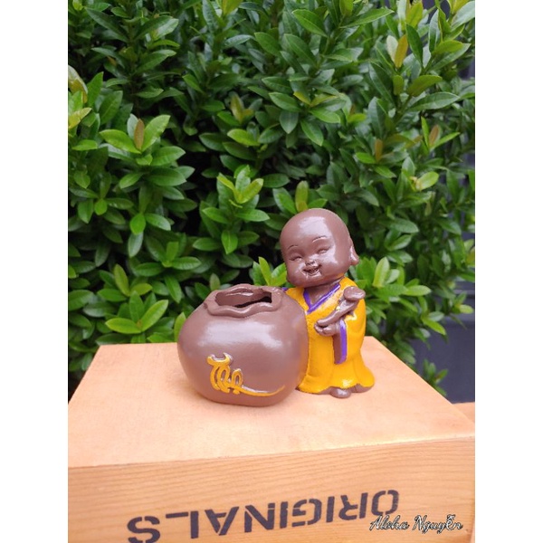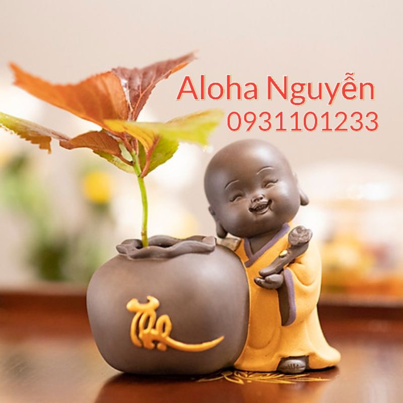 Chậu trồng cây để bàn hình chú tiểu dùng để trồng sen đá và các cây nhỏ. minichú tiểu chữ thọ cầm ngọc như ý