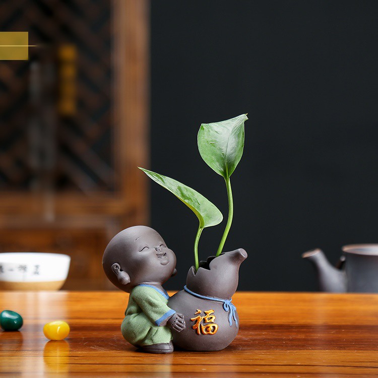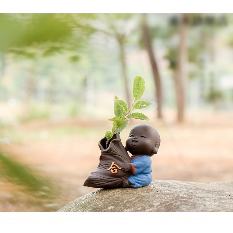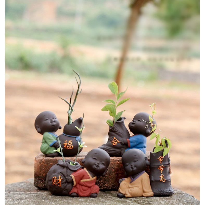 Bộ Tượng Chú Tiểu Và Chậu Trồng Cây Cầu Phúc 03Tượng gốm với các chú tiểu vui tươi , có thể trang trí làm chậu hoa hay set tiểu cảnh rất dễ thương và đáng yêu. Chất liệu gốm cát đẹp.