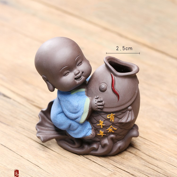 Tượng trồng cây chú tiểu cưỡi cá- Tượng trang trí để bàn - Tượng Chú Tiểu Bên Cá Chép