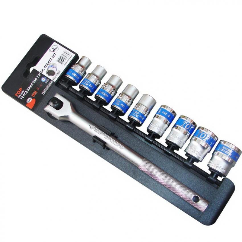 - Bộ đầu tuýp 1/2" gồm 9 size khác nhau: 10, 11, 12, 13, 14, 17, 19, 22, 24mm, được chế tạo bằng thép CR-V, chịu lực cao, và được phủ 1 lớp xi cao cấp sáng bóng. Trên mỗi đầu tuýp được khắc thương hiệu TOP–Germany Standard, và quy cách size giúp dễ nhận biết khi dùng.