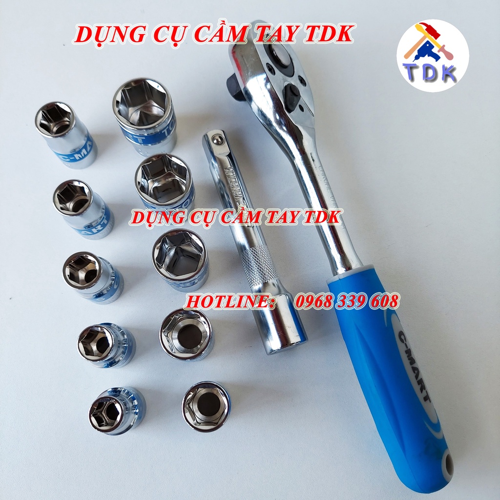 - 10 cỡ đầu tuýp 1/2": 10, 11, 12, 13, 14, 15, 17, 19, 21, 22 mm. Trên mỗi đầu tuýp được khắc thương hiệu C-MART TOOLS và quy cách size giúp dễ nhận biết khi dùng.