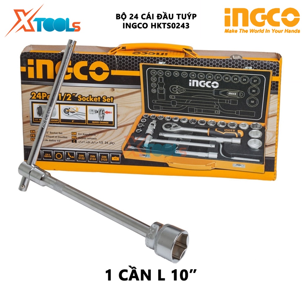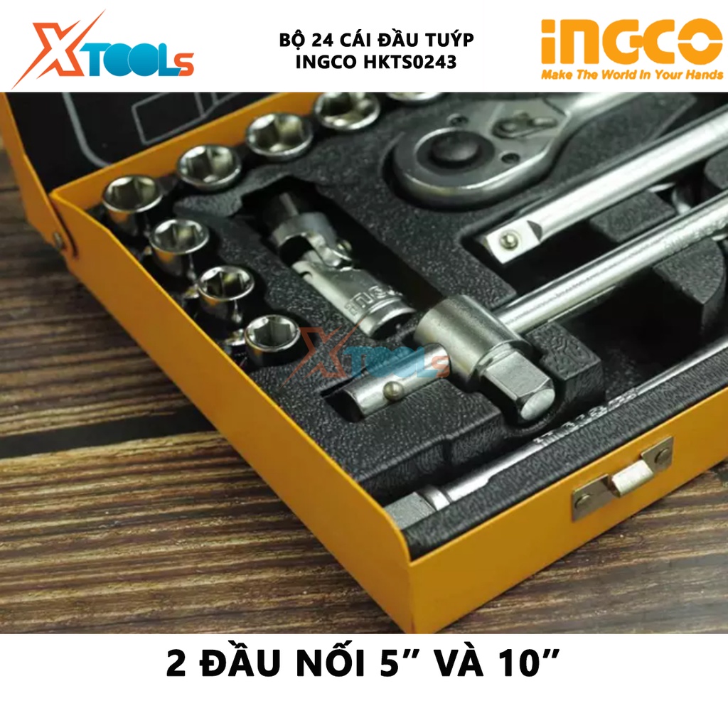 Bộ tuýp 24 chi tiết INGCO HKTS0243 | Bộ 24 cái đầu tuýp, cần siết 1/2'', dụng cụ sửa xe, gồm 18 đầu tuýp 2 cần nối 5″ và