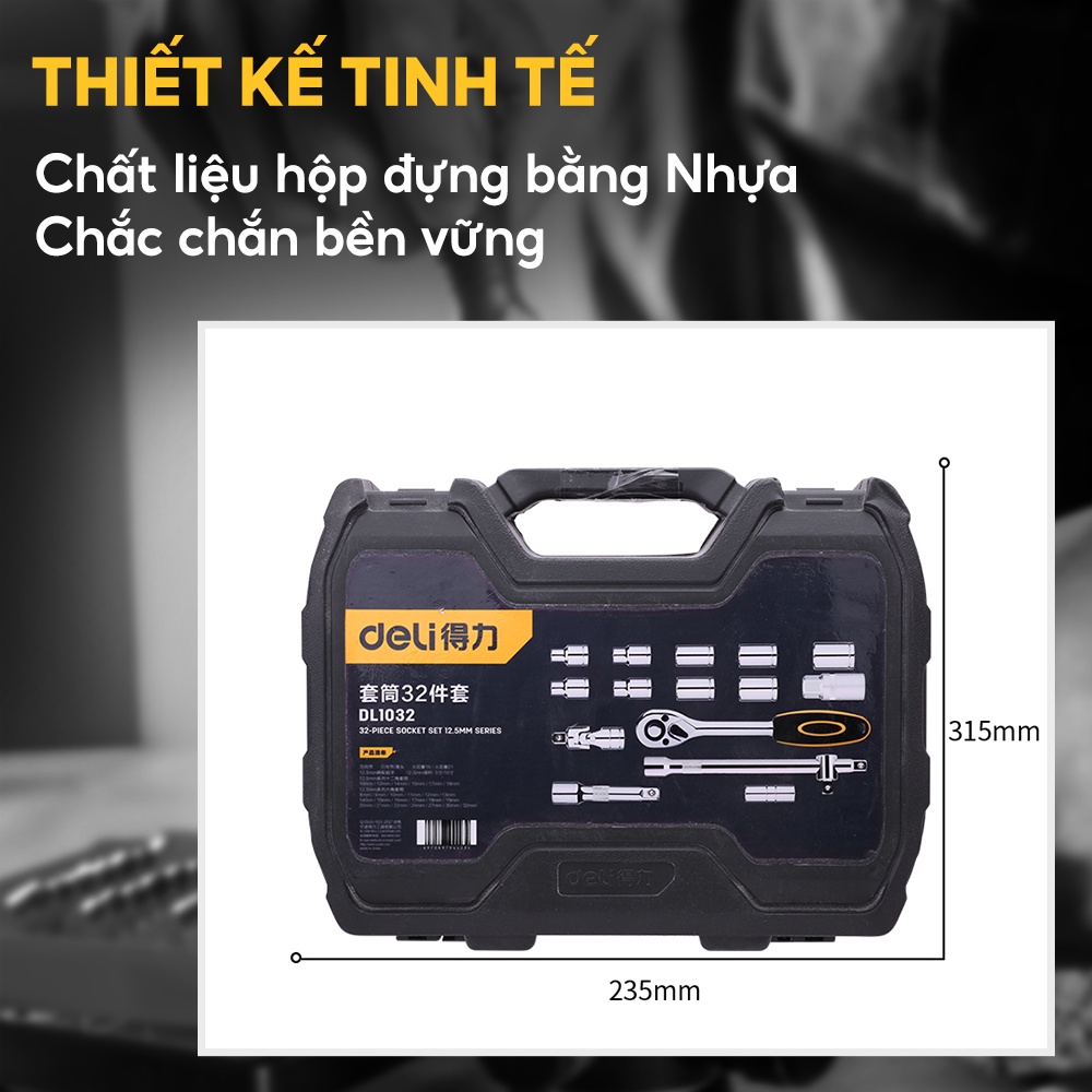 Tên sản phẩm: Bộ đầu tuýp 32 chi tiết thương hiệu Deli DL1032Chức năng: Dùng để mở bu long, đai ốc cần lực xiết mạnh