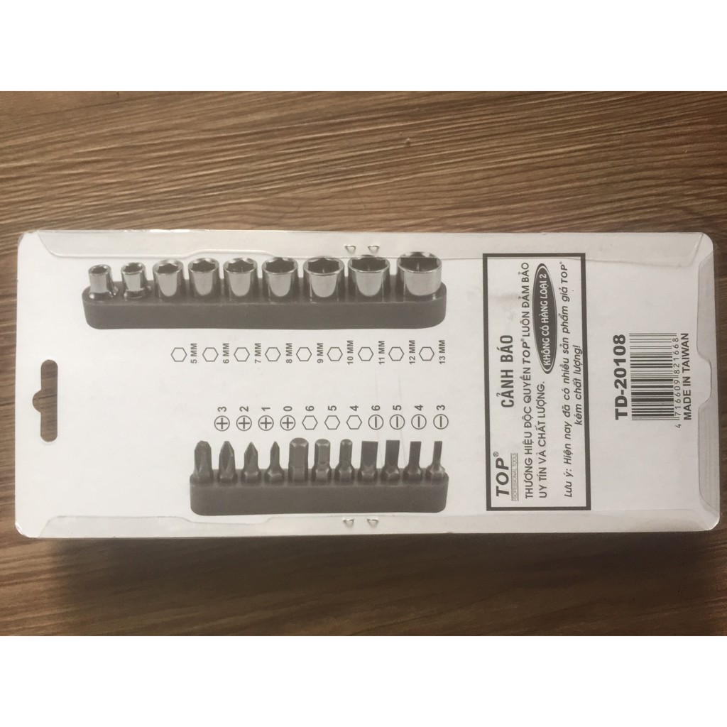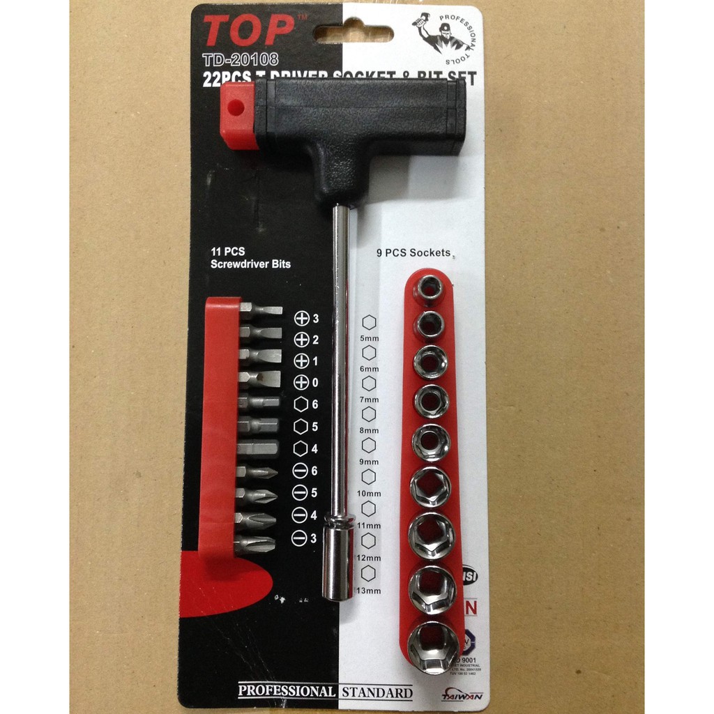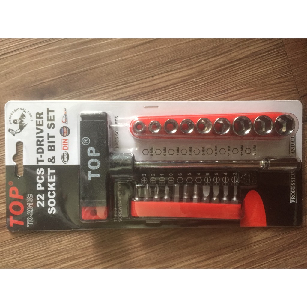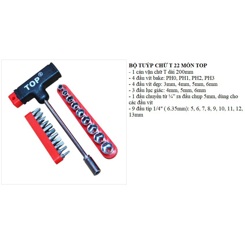 Mô tả sản phẩm Bộ tuýp đa năng chữ T 22 món TOP TD-20108Chất liệu: Thép và nhựacao cấp