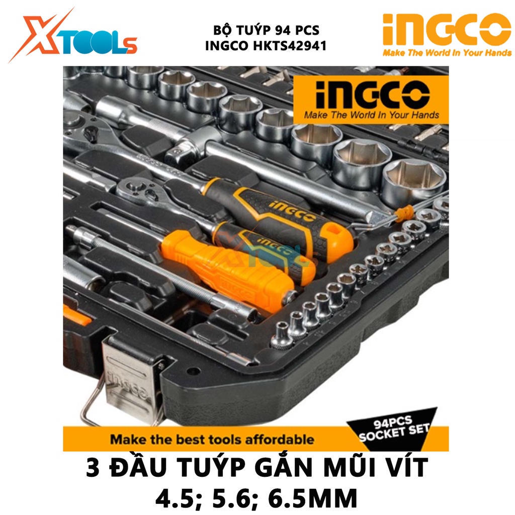 - Bộ 94 đầu tuýp 1/4 in và 1/2 in INGCO HKTS42941 là bộ sản phẩm mà mỗi người thợ nên sở hữu cho riêng mình để thực hiện làm việc từ cơ bản cho đến việc chuyên nghiệp một cách thuận tiện và dễ dàng.