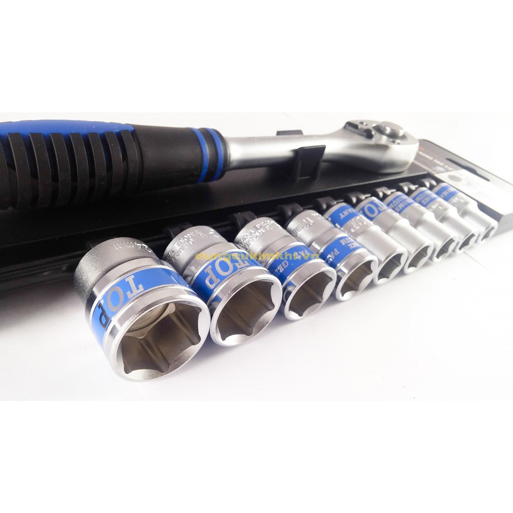 Bộ tuýp TOP TBS-12245 được sản xuất với chất lượng tốt với thương hiệu TOP có tiếng của Đài Loan. Toàn bộ các chi tiết được làm bằng thép cứng và phủ xi mờ cao cấp. Các chi tiết sắc nét thể hiện chất lượng của sản phẩm. Với 9 đầu khẩu có kích thước từ 10mm đến 24mm là kích thước bu lông đai ốc phổ biến trong các hệ máy móc và trang thiết bị cơ khí. Đầu nối cần khóa đầu khẩu với kích thước tiêu chuẩn 1/2 inch có thể sử dụng chung với các cần siết tiêu hoặc máy vặn ốc chuẩn.Đi kèm theo trong bộ là cần siết tự động 2 chiều đầu vuông. Sau khi chọn chiều quay bạn chỉ quay theo chiều ngược lại để lấy lực mà không cần tháo đầu khẩu ra khỏi bu lông để tra lại rất tiện dụng giúp cho thao tác trở nên nhanh chóng và dễ dàng. Nếu cần xoay theo chiều ngược lại chỉ cần gạt lẫy là xong. Cán cần siết được tạo vân chống trượt