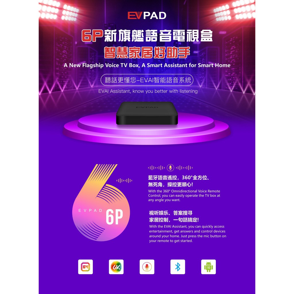 – EVPAD 6P được cung cấp bởi Android 10.0, dễ sử dụng và hỗ trợ tìm kiếm bằng giọng nói mang đến một thế giới nội dung mà cả gia đình có thể thưởng thức.