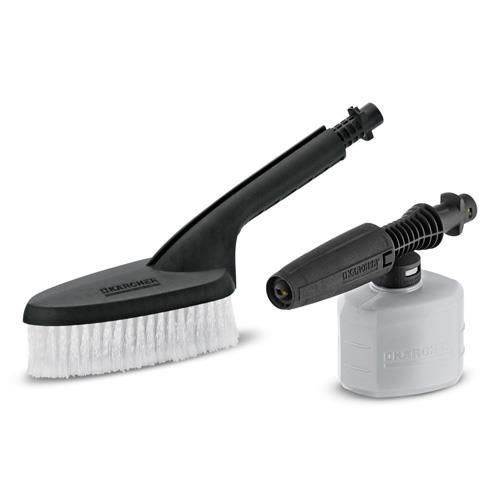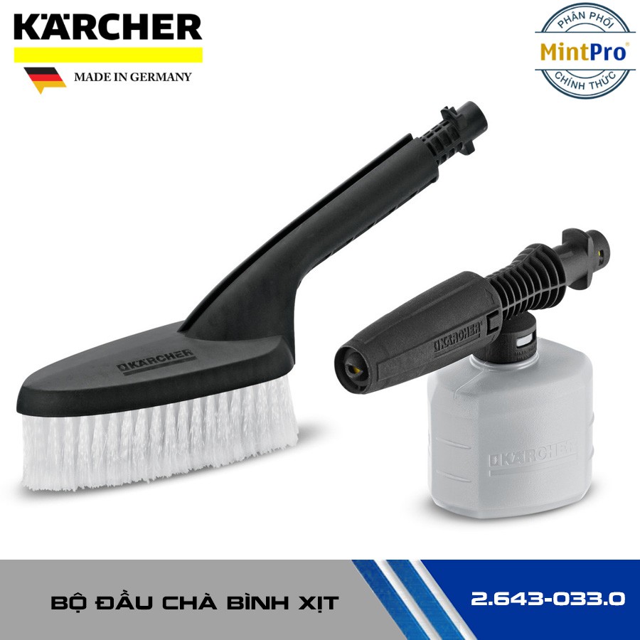 Bộ đầu chà và bình xịt là phụ kiện đi kèm chuyên dụng cho máy rửa xe Karcher. Đầu chà và bình xịt dành cho máy rửa xe Karcher với đầu lông chải cứng, nhờ đó có thể đánh bật mọi vết bẩn kể cả đó là vết bẩn lâu ngày. Bản chải máy rửa xe được làm bằng chất liệu nhựa cao cấp có độ bền cao, nhờ đó người sử dụng có thể dùng trong thời gian dài mà không bị hư hỏng gì.