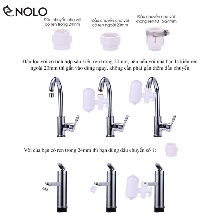 Sản phẩm có kèm theo bộ đầu chuyển và nối thêm nên đầu lọc có thể gắn được hầu hết các dạng vòi nước trên thị trường.