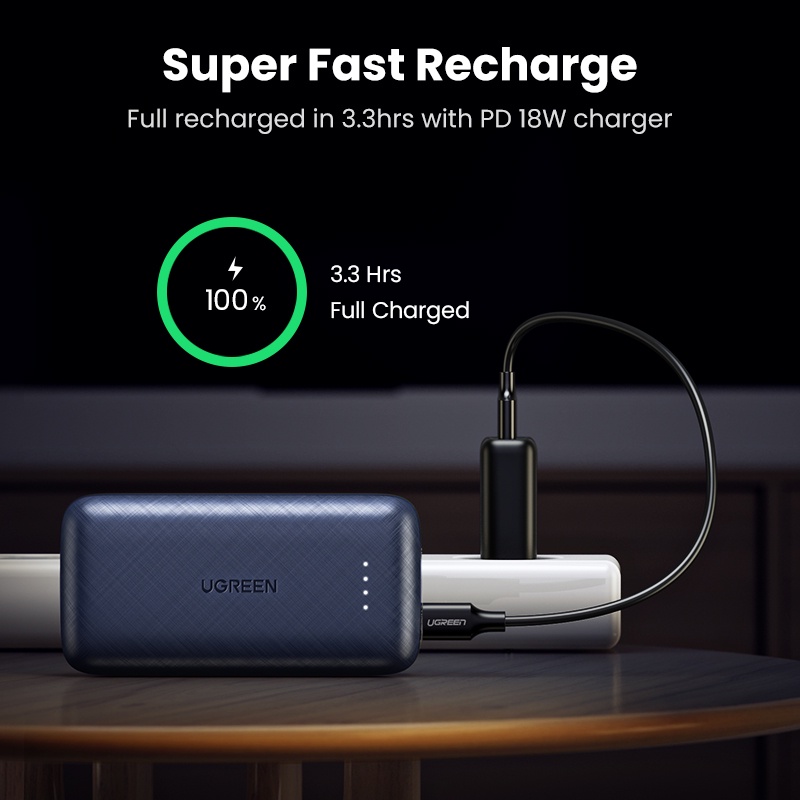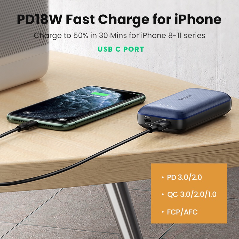 Giới thiệu [UGRE90K giảm 90K] Pin sạc dự phòng mini 10000mAh 2 cổng UGREEN 80749 - PD + QC 3.0 18W Sạc nhanh iPhone 12 50% pin 30'