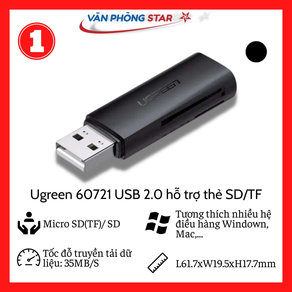 Giới thiệu Ugreen 60721 Màu Đen Đầu đọc thẻ card reader USB 2.0 hỗ trợ thẻ SD/TF CM264 20060721