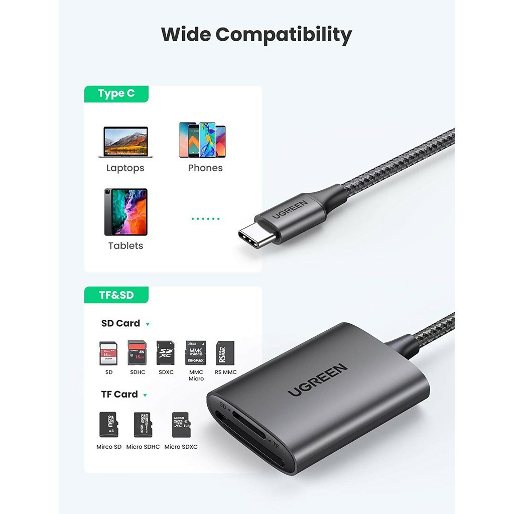 Ugreen 80888 - Đầu đọc thẻ SD/TF chuẩn USB, USB-C vỏ nhôm chính hãng - Phukienleduy