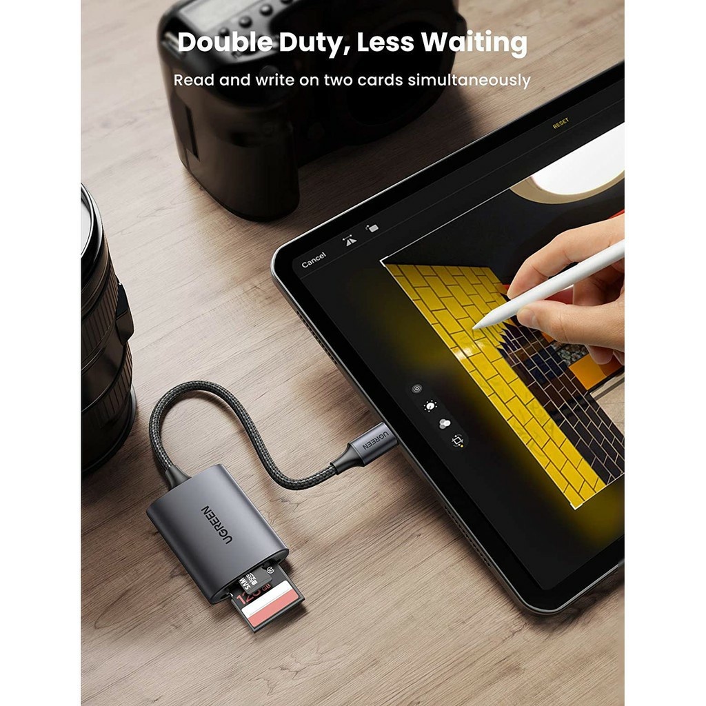 ◇ Đầu đọc thẻ khe cắm kép: Bộ chuyển đổi thẻ nhớ USBUgreen sang SD 2 trong 1 mang đến cho bạn sự linh hoạt và tiện lợi khi truy cập nhiều loại thẻ nhớ. Với việc hỗ trợ đọc và ghi đồng thời 2 thẻ, bạn có thể dễ dàng xem lại tệp hoặc sao lưu và lưu trữ ảnh và video trong thẻ UHS-I SD, SDHC, SDXC, MICRO SD, MICRO SDHC, MICRO SDXC. Hơn nữa, nó hỗ trợ thẻ UHS-II SD/TF, nhưng tốc độ sẽ là UHS-I.
