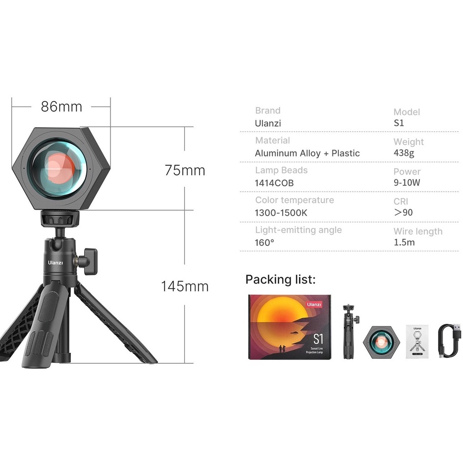 TÍNH NĂNG:◾ Ulanzi S1 Sunset Live Projection Lamp với Nhiệt độ màu 1300-1500K, CRI >90 và 3 mức điều chỉnh độ sáng.
