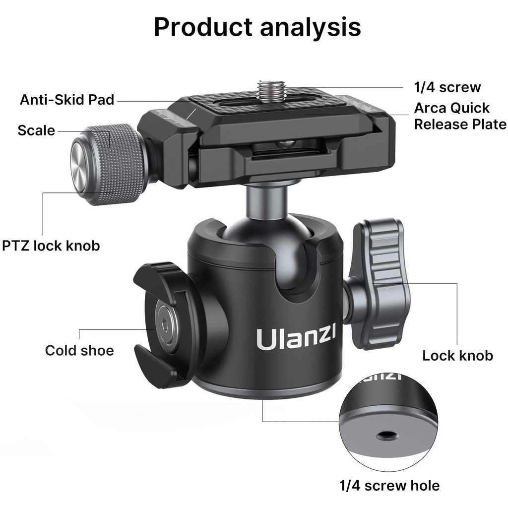 ◾ ArcaSwiss + Quick Release Plate: Khả năng tương thích rộng, nó có vít hạn chế để ngăn máy ảnh rơi ra.◾ Đầu bóng ULANZI chỉ nặng 4,20 oz nhưng cung cấp khả năng chịu tải 22 lbs. Đầu bóng ULANZI trang bị 2 khe hình chữ U để điều chỉnh ngang / dọc / bên, điều chỉnh camera của bạn ở mọi góc độ.