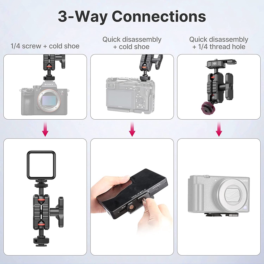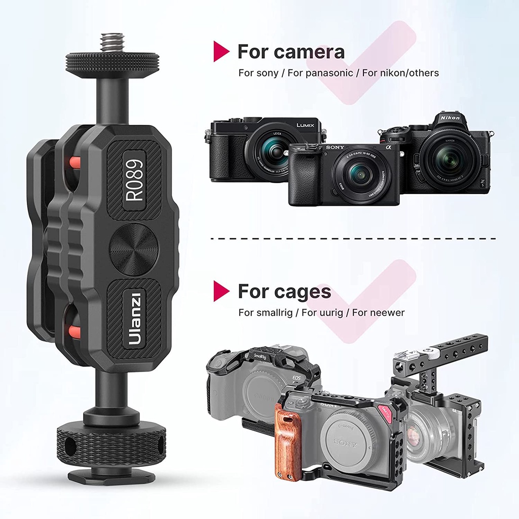 ◾ Tương thích rộng rãi: Giá treo màn hình R089 vừa với tất cả các máy ảnh và tương thích với lồng máy ảnh UURig, Smallrig, Neewer, CAMVATE,..