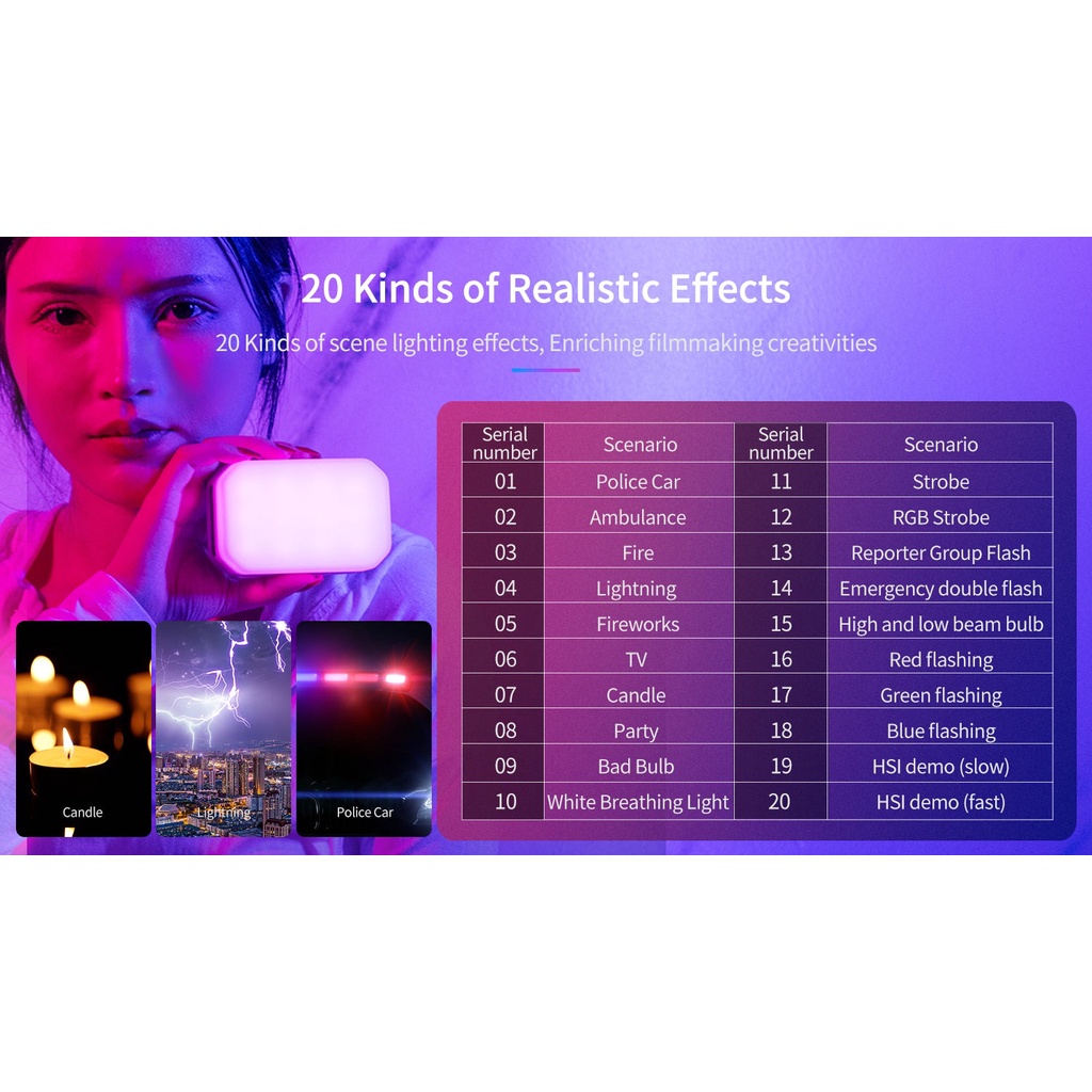 ◾ 20 loại hiệu ứng ánh sáng hiện trường: P0lice Car, Ambulance, Fire, Lightning, Fireworks, TV, Candle, Party, Bad Buld, White Breathing Light, Strobe, RBG Strobe, Reporter Group Flash, Emergency double flash, High and low beam bulb, Red flashing, Green flashing, Blue flashing, HIS demo (slow), HIS demo (fast).