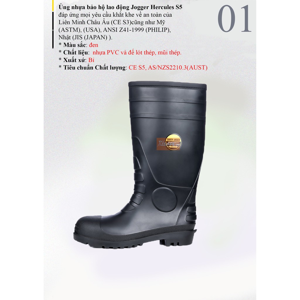 Ủng bảo hộ Jogger Hercules được thiết kế theo tiêu chuẩn EN ISO 20345 / S5 SRA. Đế ủng được xếp loại chống trượt SRA. Ủng có mũi thép và lót thep chống đinh. Ngoài ra, ủng còn có đặc tính chống tĩnh điện, gót giảm xóc. Ủng làm từ PVC nên chống thấm nước 100%.