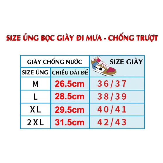 Bảo vệ bạn những lúc trời mưa, ngập. Mùa mưa đến nên mọi người đều rất ngại đi ra đường. Tuy nhiên vì công việc phải thường xuyên đi ngoài đường nên không thể tránh khỏi mưa ướt. Việc đi cả ngày ngoài đường với đôi giày ướt sẽ làm cho bạn khó chịu, bị nấm chân, nước ăn chân. Sản phẩm bọc giày đi mưa giúp bạn không bị ướt giày, trơn trượt không an toàn khi lái xe và còn dẫn đến các bệnh về chân trong mùa mưa. Bọc giày được làm bằng chất liệu chống nước tuyệt đối, giày ôm chặt với chân. Phần đế giày được thiết kế chống trơn trượt. Hãy bảo vệ đôi chân của bạn trong mùa mưa này nhé!