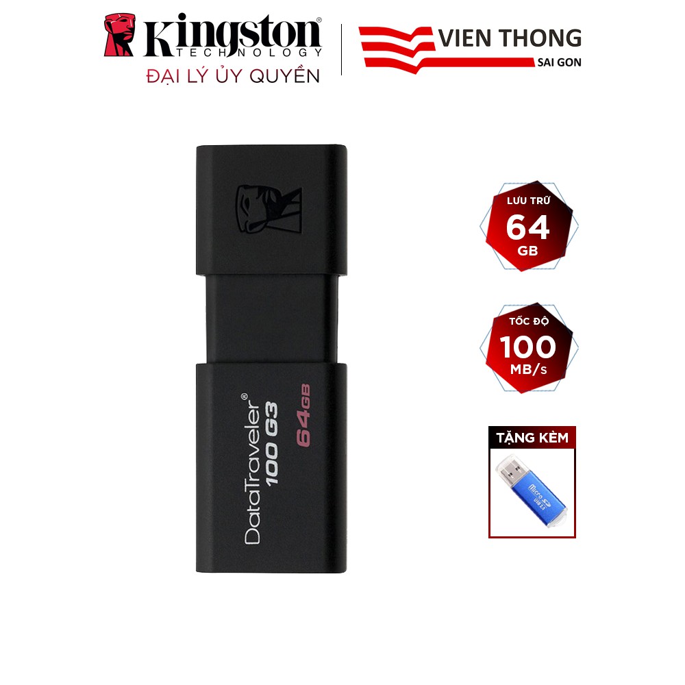 USB 3.0 Kingston DT100G3 64GB tốc độ upto 100MB/s tặng đầu đọc thẻ