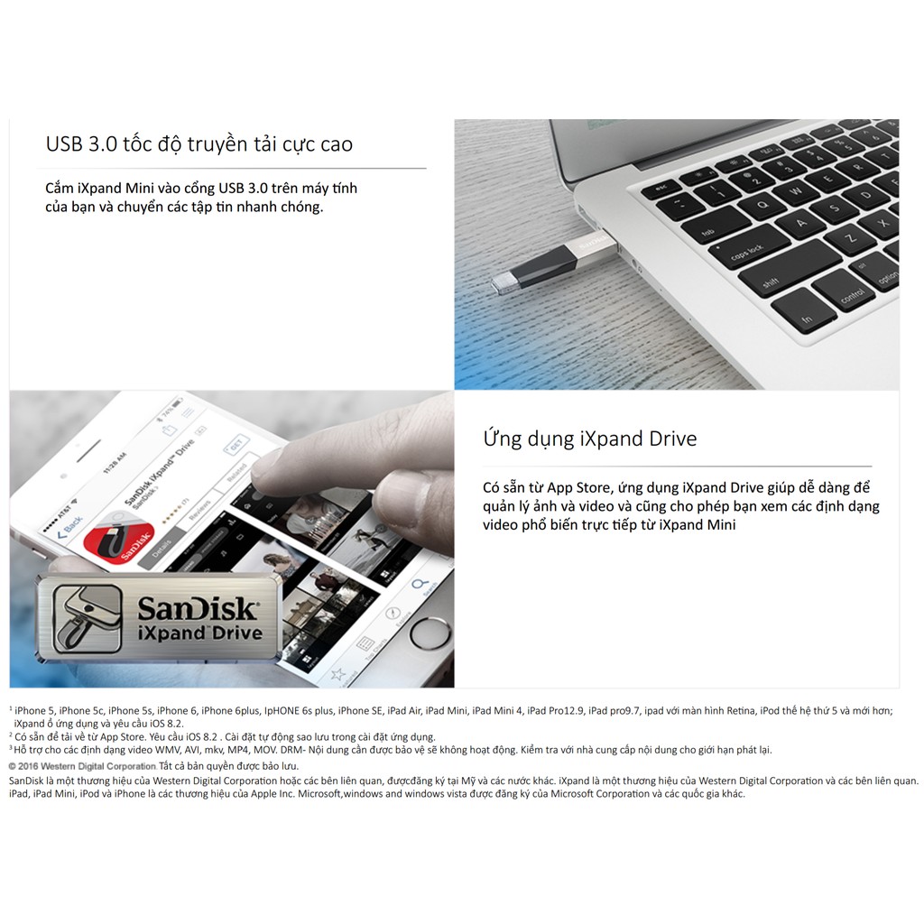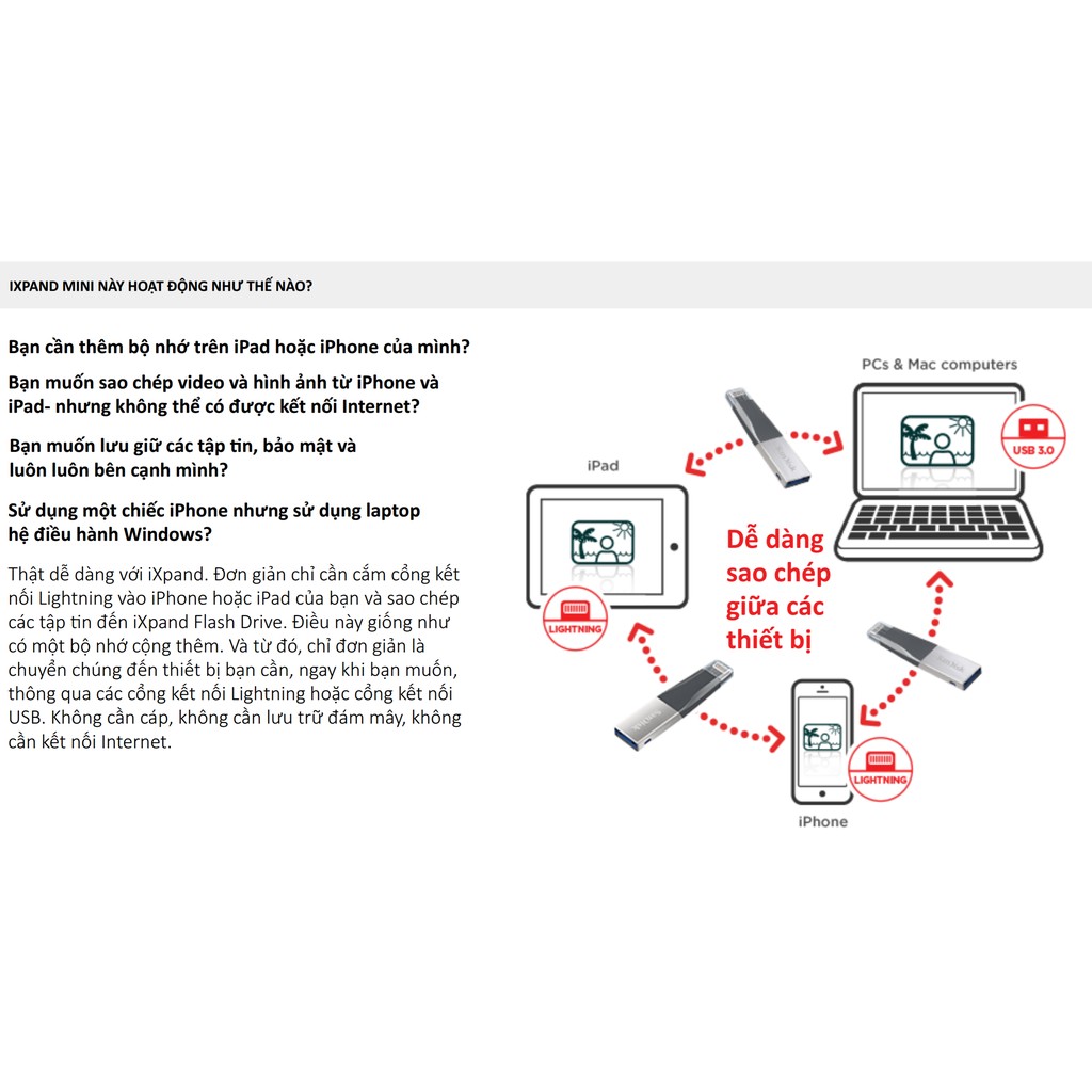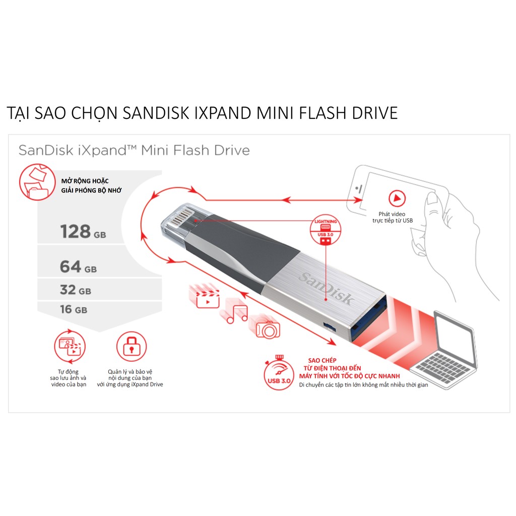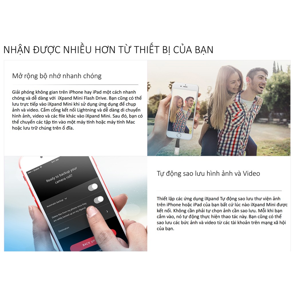 Được thiết kế cho iPhone, iXpand Mini Flash Drive giúp giải phóng bộ nhớ cho iPhone một cách dễ dàng, tự động sao lưu thư viện ảnh và cho phép bạn xem video định dạng tiêu chuẩn trực tiếp từ iXpand Mini. iXpand Mini có cổng kết nối Lightning linh hoạt, tương thích hầu hết các loại vỏ bảo vệ iPhone và cổng kết nối USB 3.0 để cắm vào PC hoặc máy tính Mac, do đó bạn có thể dễ dàng sao chép dữ liệu. iXpand Mini Flash Drive bao gồm phần mềm mã hóa giúp bạn bảo vệ các tập tin vì vậy bạn có thể chia sẻ nội dung trong khi vẫn giữ tập tin cá nhân an toàn trên thiết bị của bạn. iXpand Mini Flash Drive mang đến một cách nhanh chóng và đơn giản để mở rộng bộ nhớ trên iPhone để bạn luôn sẵn sàng để chụp và lưu giữ những kỉ niệm.Sản phẩm SanDisk được xây dựng với tiêu chuẩn cao nhất và thử nghiệm chặt chẽ. Bạn có thể tự tin trong e nổi bật chất lượng, hiệu quả và độ tin cậy của tất cả các sản phẩm SanDisk.
