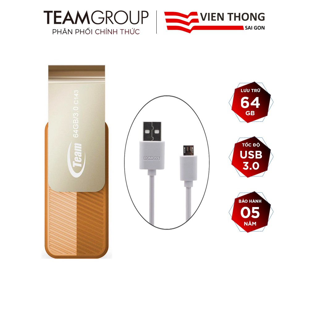 Máy tính & Laptop > Thiết Bị Lưu Trữ > USB & OTG || USB 3.0 Team Group C143 64GB nắp xoay 360 + Cáp micro USB tròn RomossCòn hàng