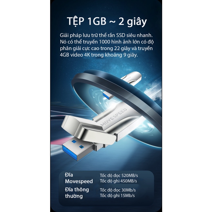 - Điểm nổi bật nhất của USB SSD MOVESPEED là nó có chức năng lưu trữ dữ liệu như 1 ổ SSD thông thường nhưng tiện lợi nhỏ gọn hơn trong hình dáng 1 chiếc USB, có thể bỏ túi mag đi mọi nơi không cần tháo lắp như ổ cứng SSD thông thường.