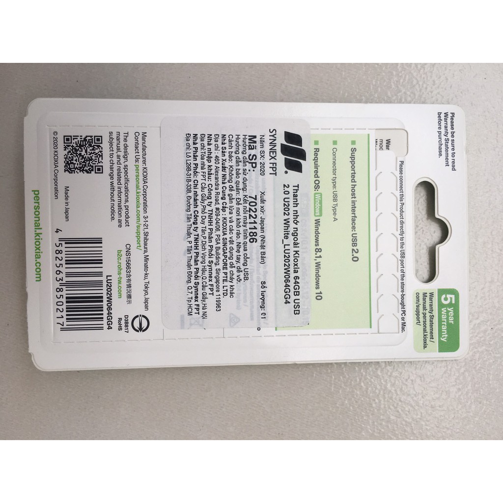 USB 64gb KIOXIA U202 chuẩn 2.0 (trắng) Japan - FPT phân phối