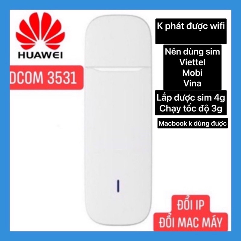 Máy tính & Laptop > Thiết Bị Mạng > Bộ Thu Wifi || USB DCOM 3G -HUAWEI 3531 HỖ TRỢ ĐỔI IP ĐỔI MAC SIÊU NHANH,DCOM 4G TỐC ĐỘ 150mbpsCòn hàng