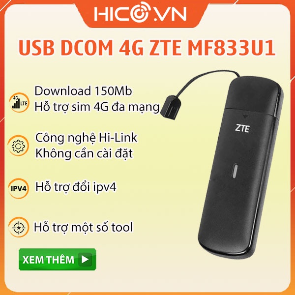 Usb Dcom 4G ZTE MF833 – Tốc độ 150Mb – Hỗ Trợ Đổi IP , Công Nghệ Hilink Cắm là Chạy, Tương Thích Một Số Tool
