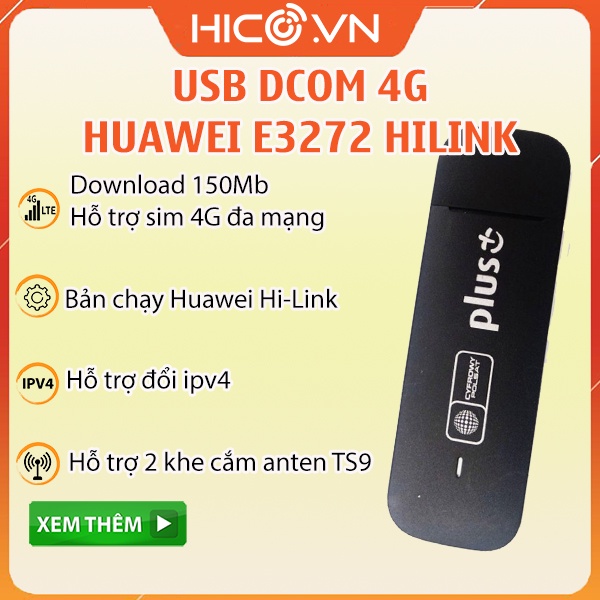 Thời đại công nghệ 4G đã chính thức bắt đầu, hàng loạt các thiết bị 4G ra đời. Một trong số đó phải kể đến Ussb Dcom 4G Huawei E3272. Đây là dòng Usb Dcom 4G đầu tiên trên thị trường nên được trang bị tất cả những tính năng và công nghệ hàng đầu.👉 Thông số kĩ thuật của USB 4G HUAWEI E3272 - Bản HILINK cắm là chạy không cần cài đặt