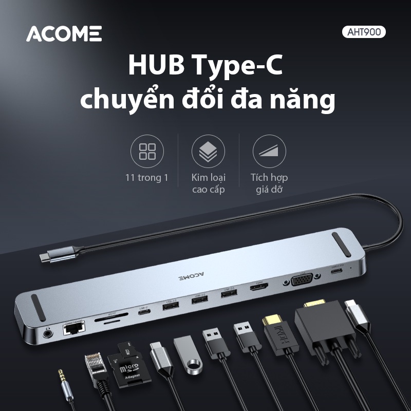 Máy tính & Laptop > Phụ Kiện Máy Tính > Bộ chia cổng USB & Đọc thẻ nhớ || USB HUB Chuyển Đổi Type-C Acome AHT900 11 in 1 Cổng USB 3.0, SD/Micro Dành Cho LaptopCòn hàng