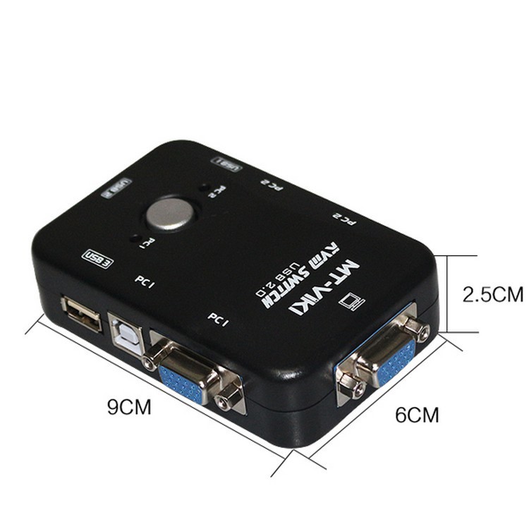 Thiết bị KVM switch bao gồm 1 bộ điều khiển hiển thị bàn phím chuột cho 2 máy tính, cổng USB 2.0,