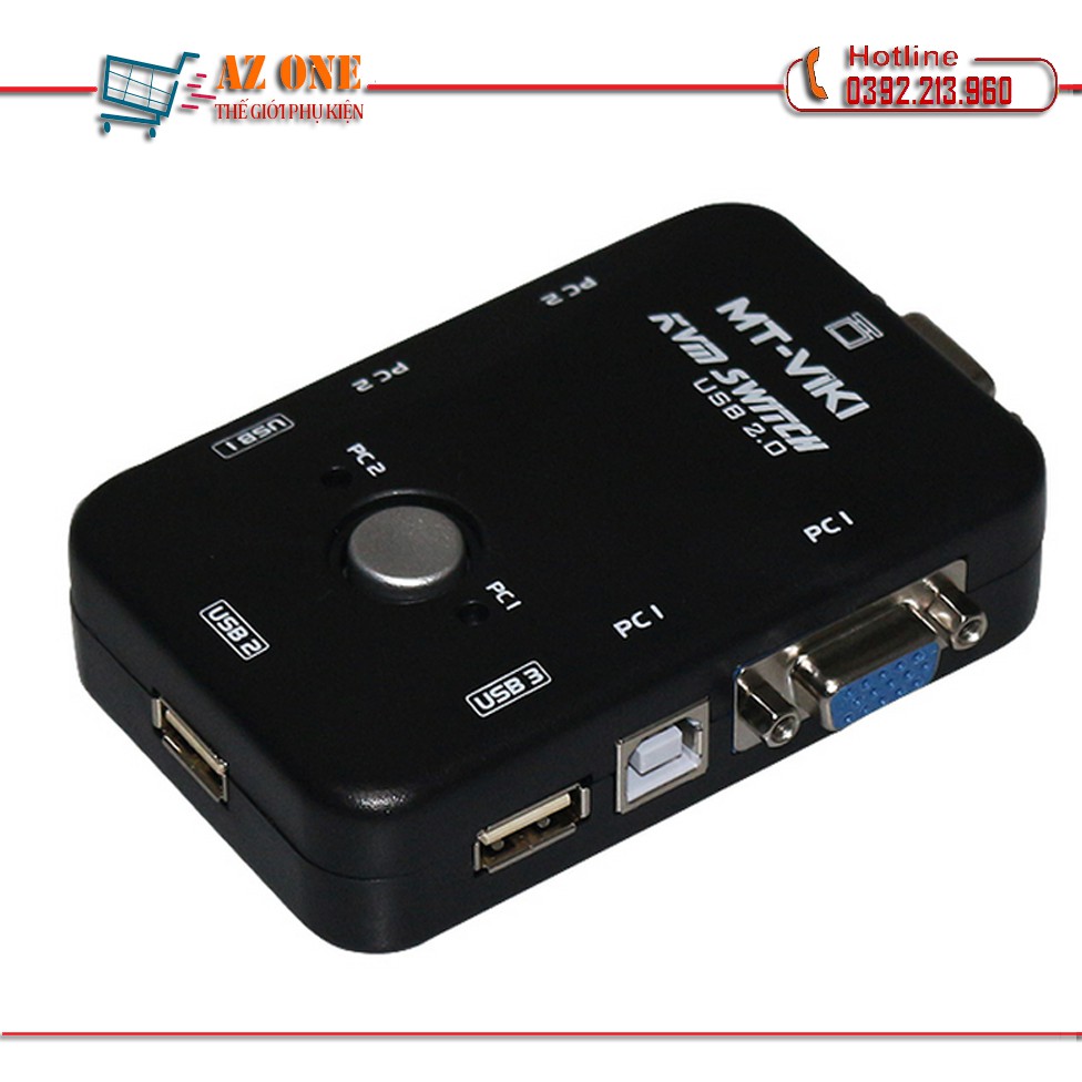 Thiết bị KVM switch bao gồm 1 bộ điều khiển hiển thị bàn phím chuột cho 2 máy tính, cổng USB 2.0,