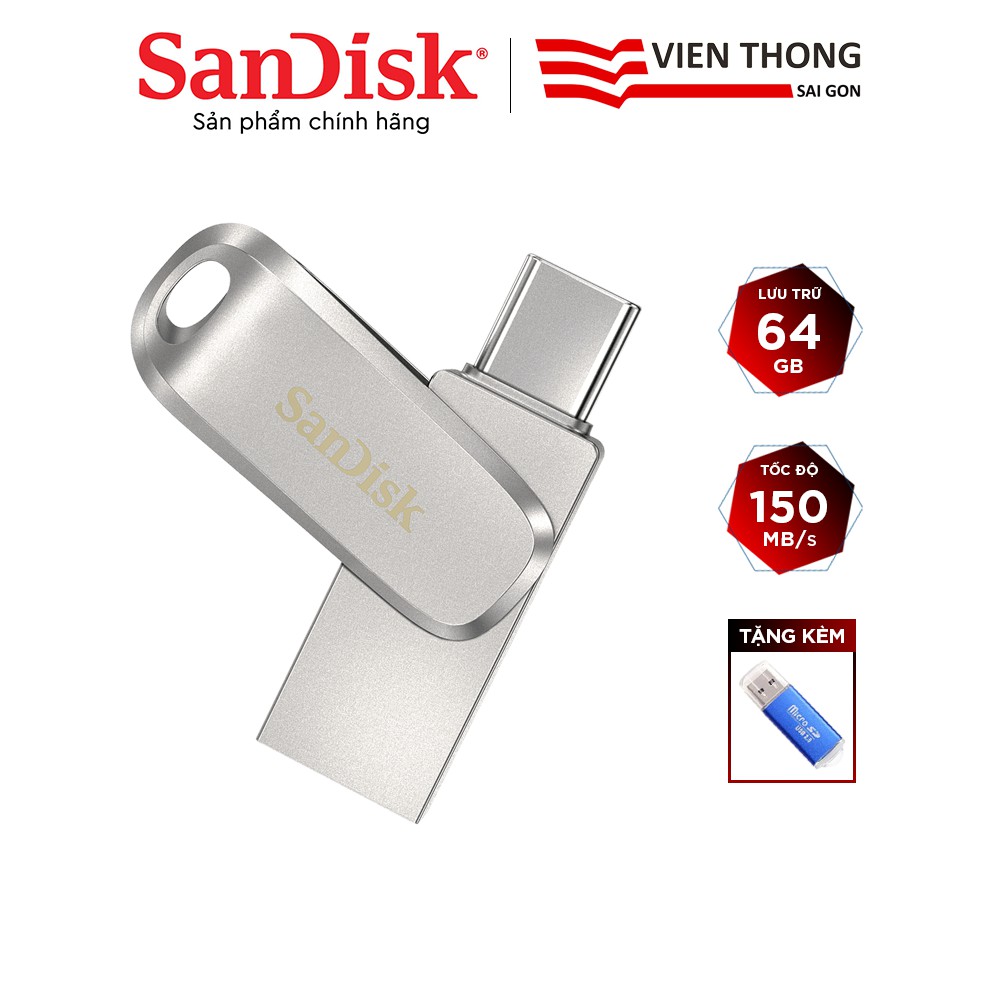 Máy tính & Laptop > Thiết Bị Lưu Trữ > USB & OTG || USB OTG 3.1 Gen 1 SanDisk 64GB SDDDC4 Ultra® Dual Drive Luxe USB Type-C upto 150MB/s vỏ kim loại tặng kèm đầu đọc thẻCòn hàng