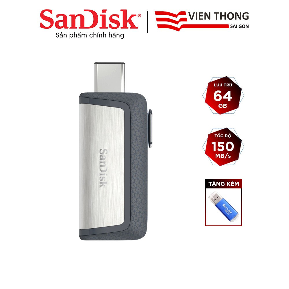 USB OTG 3.1 Gen 1 SanDisk SDDDC2 Ultra 64GB Dual Drive USB Type-C upto 150MB/s tặng đầu đọc thẻ nhớ