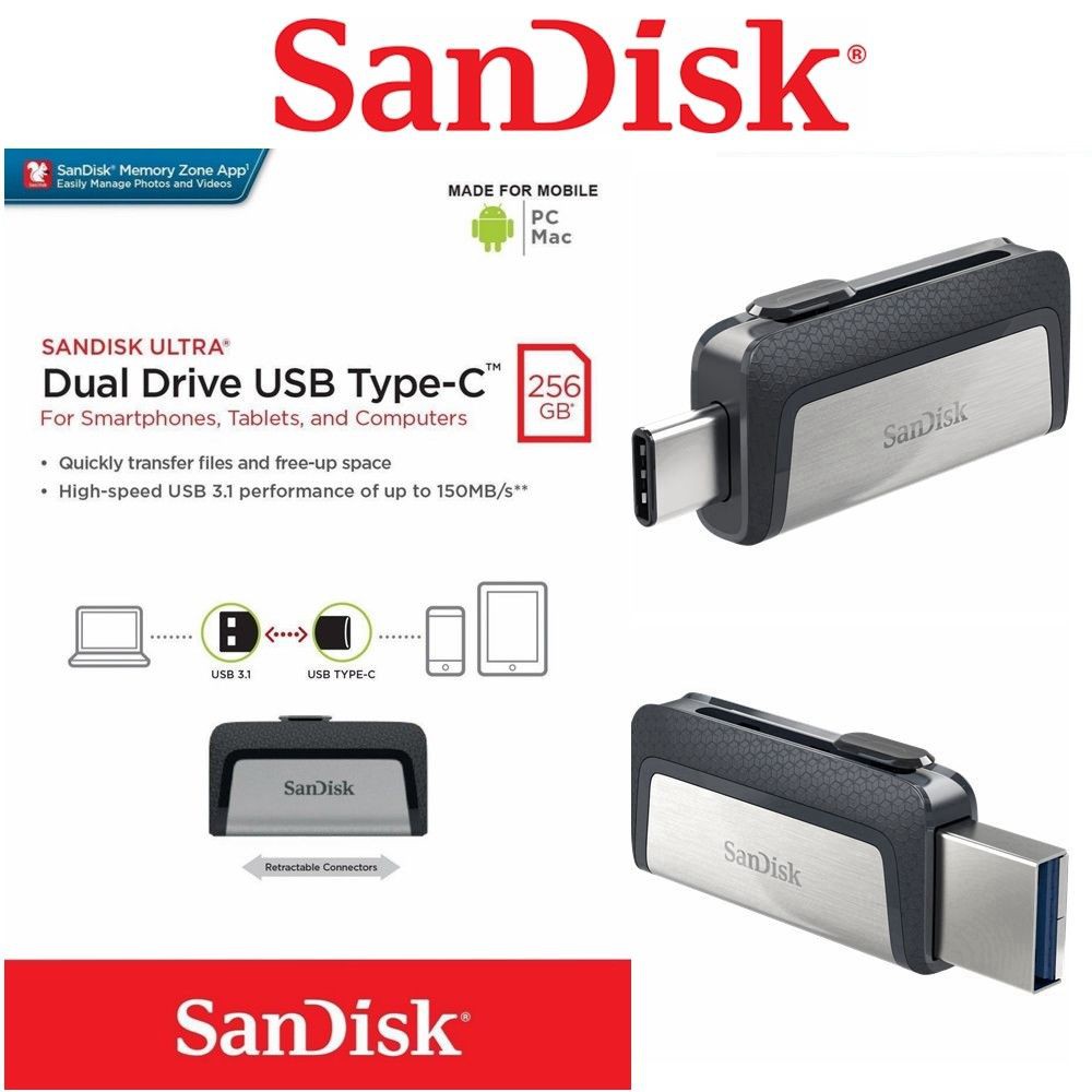 Với chuẩn giao tiếp USB 3.1 tốc độ siêu cao lên đến 150MB/s, giúp bạn giải phóng không gian lưu trữ trên điện thoại của bạn hoặc di chuyển nội dung giữa các thiết bị di động có trang bị giao tiếp chuẩn USB Type-C. Ngoài ra, USB SanDisk Ultra Dual Type-C USB 3.1 DDC2 có thêm một đầu kết nối USB Type A truyền thống, cho phép bạn dễ dàng chuyển các tập tin giữa điện thoại thông minh, máy tính bảng và máy tính. Ứng dụng đi kèm “SanDisk Memory Zone” trên Android (có sẵn trên Google Play) giúp bạn quản lý vào sao lưu tập tin dễ dàng hơn.