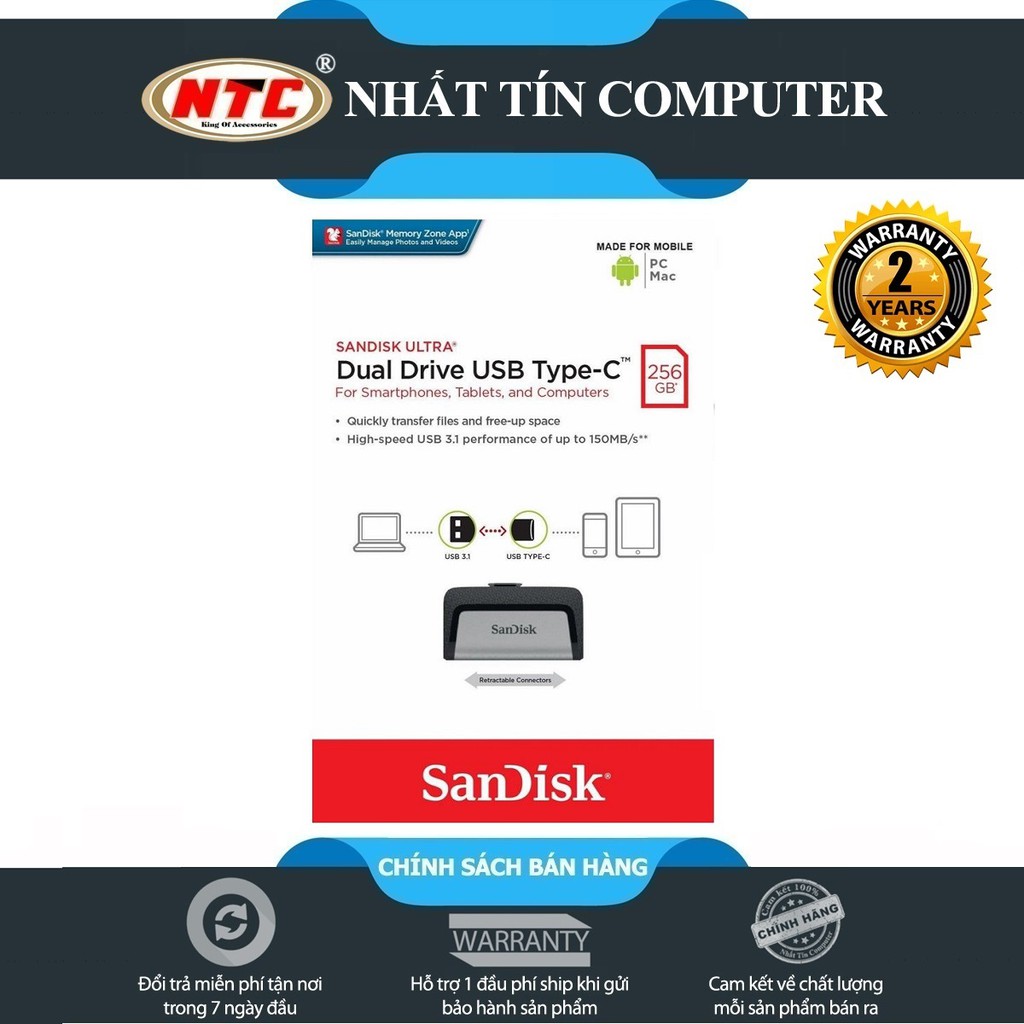 Máy tính & Laptop > Thiết Bị Lưu Trữ > USB & OTG || [Mã 273ELHA100K0 hoàn 7% đơn 500K] USB OTG Sandisk Ultra Dual Type-C 3.1 256GB 150MB/s (Bạc)Còn hàng