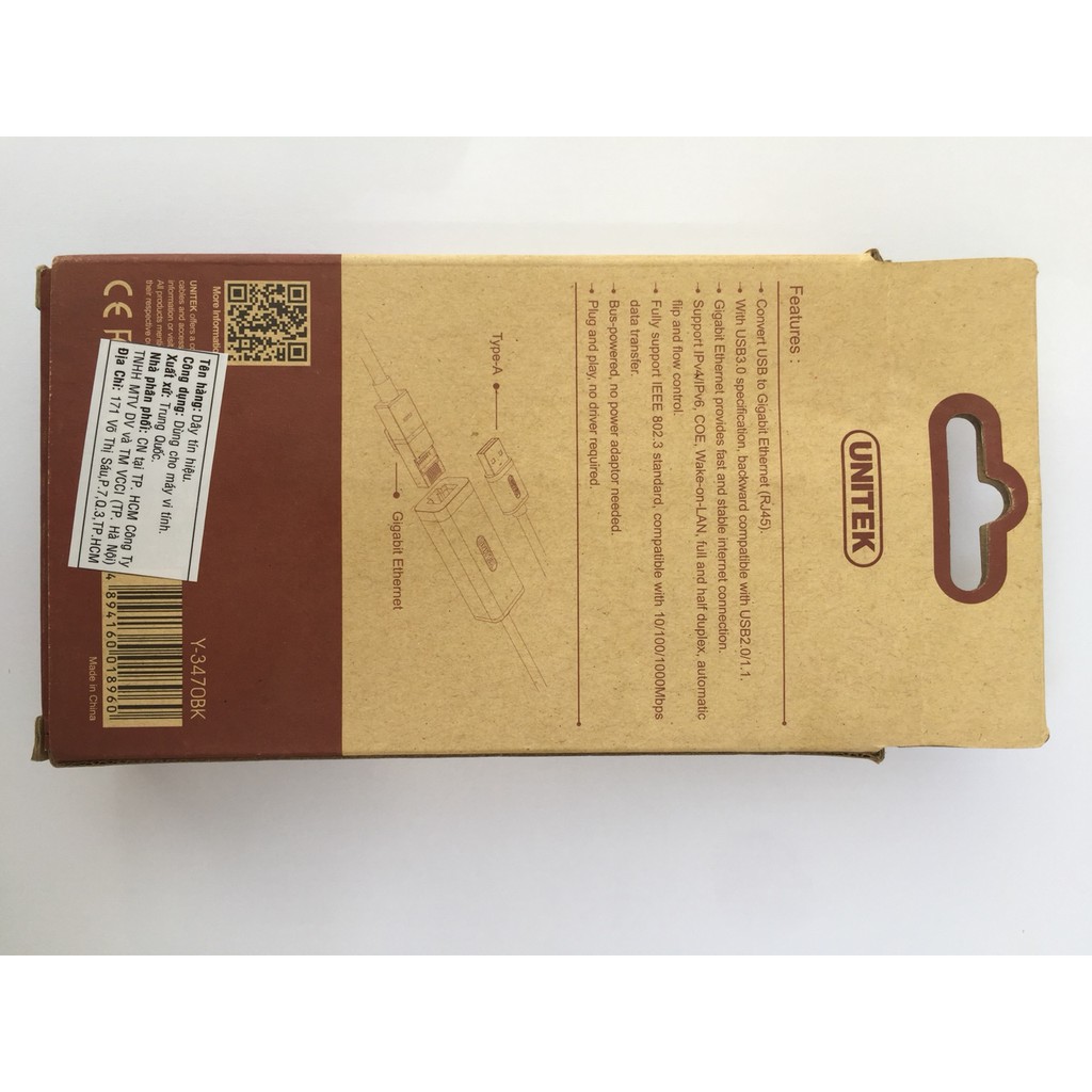 Máy tính & Laptop > Thiết Bị Mạng > Bộ Thu Wifi || [Mã 253ELSALE hoàn 7% đơn 300K] USB ra Lan (Lan gigabite 10/100/1000) USB 3.0 Unitek Y-3470BKCòn hàng