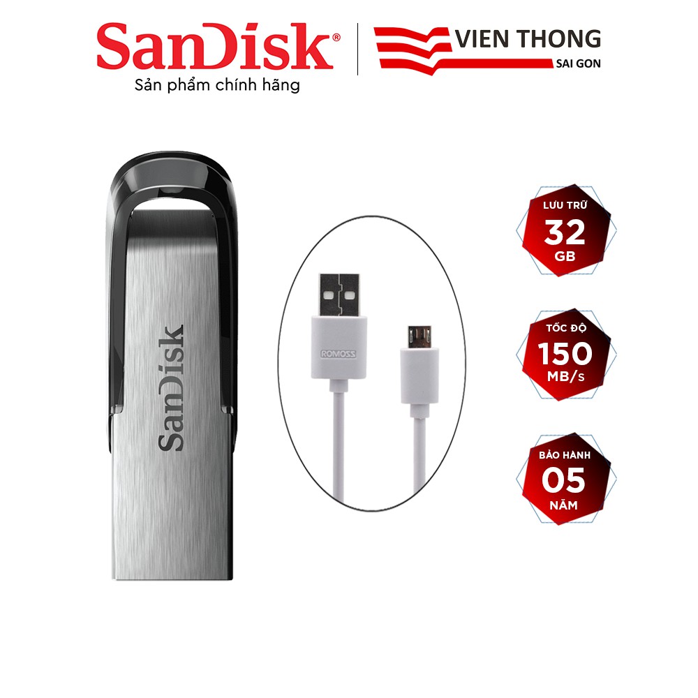 Máy tính & Laptop > Thiết Bị Lưu Trữ > USB & OTG || USB SanDisk Ultra Flair CZ73 32GB / USB 3.0 upto 150MB/s + Cáp sạc micro USB tròn RomossCòn hàng