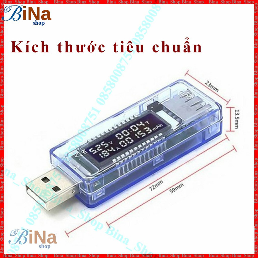 Màn hình hiển thị : Điện áp (V), dòng tiêu thụ (A), dung lượng đo được (mAh), thời gian đo (T) (phút) ...