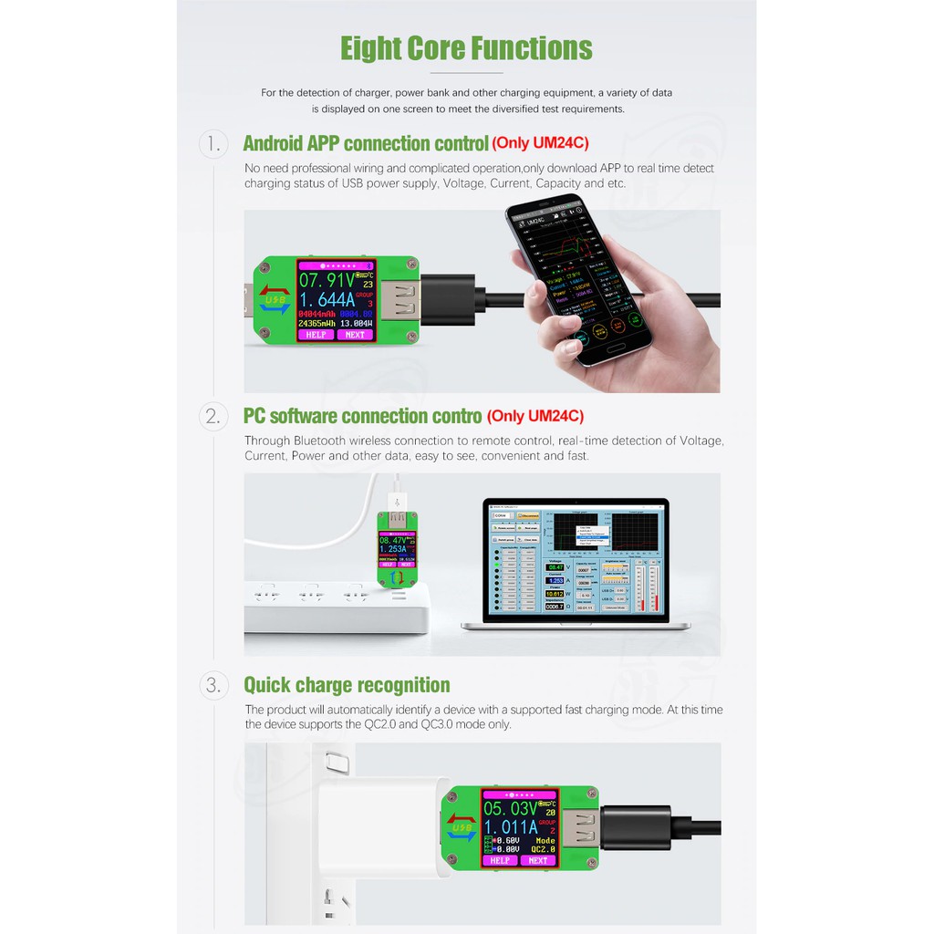 + UM24C - có hổ trợ kết nối Bluetooth với điện thoại Android (cần tải app). Có hổ trợ kết nối với PC/Laptop qua phần mềm. Windows 7 trở lên.