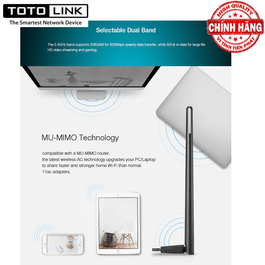 USB Thu WiFi Băng Tần Kép 5Ghz và 2.4Ghz - TotoLink A650UA ( Chuẩn MU-MIMO / AC650 ) tốc độ 650Mbps