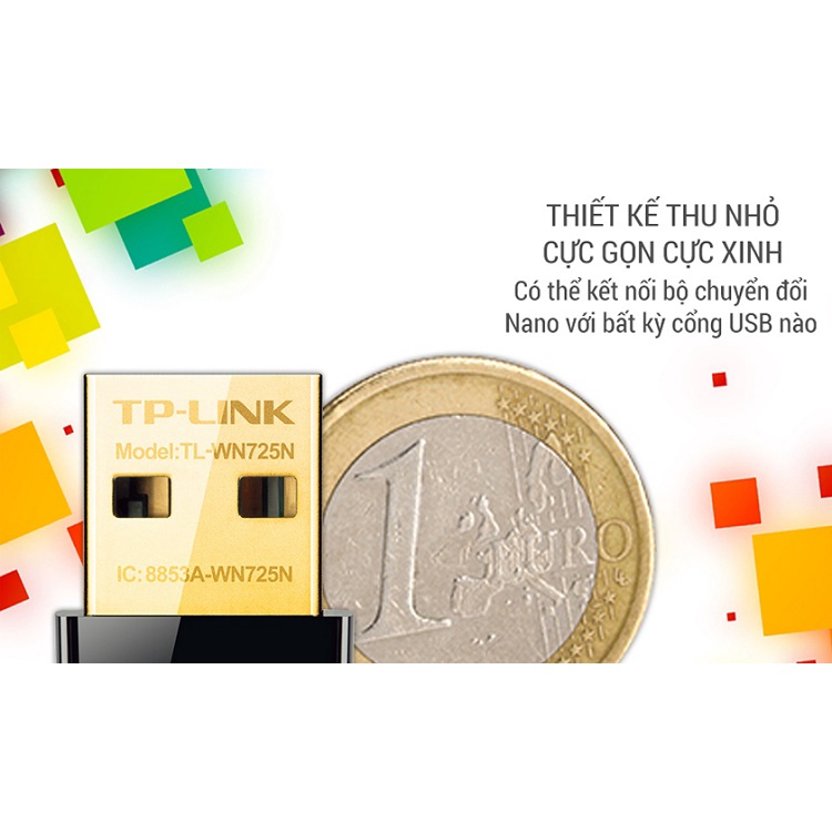 Bô chuyển đổi USB Nano chuẩn N không dây tốc đô 150Mbps TL-WN725N của TP-LINK cho phép người dùng kết nối một máy tính để bàn hoặc máy tính xách tay với mạng không dây tốc độ 150Mbps. TL-WN725N được thiết kế để mạng lại tính thuận tiện cao nhất cho người dùng, khi đã kết nối vào cổng USB của máy tinh thì có thể để lại đó, cho dù đi du lịch hay ở nhà. Thiết bị cũng sở hữu tính năng mã hóa không dây nâng cao và dễ dàng cài đặt.
