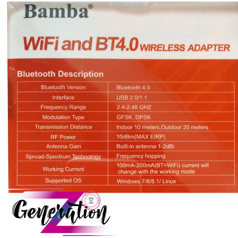 Usb Thu Wifi+ Bluetooth 4.0 BAMBA cho phép kết nối dữ liệu không dây giữa máy tính và các thiết bị có hỗ trợ Bluetooth, các thiết bị Kỹ thuật số cá nhân, và các thiêt bị khác có thể kết nối không dây với máy tính của bạn. Các thiết bị có thể kết nối với nhau trong phạm vi 20m.Phần mềm hỗ trợ: Phần mềm Bluetooth của Microsoft, CSR Harmony, Bluez, Bluesol