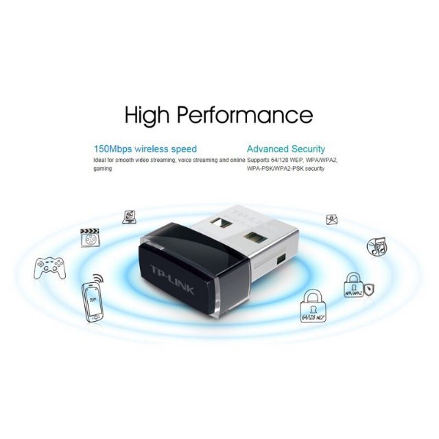 Bộ chuyển đổi USB Nano chuẩn N không dây tốc độ 150Mbps TL-WN725N của TP-LINK cho phép người dùng kết nối một máy tính để bàn hoặc máy tính xách tay với mạng không dây tốc độ 150Mbps. TL-WN725N được thiết kế để mạng lại tính thuận tiện cao nhất cho người dùng, khi đã kết nối vào cổng USB của máy tinh thì có thể để lại đó, cho dù đi du lịch hay ở nhà. Thiết bị cũng sở hữu tính năng mã hóa không dây nâng cao và dễ dàng cài đặt