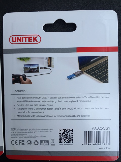 Máy tính & Laptop > Thiết Bị Lưu Trữ > USB & OTG || Usb type C to usb 3.0 Unitek , Đầu chuyển đổi TYPE C sang USB 3.0 Unitek Y-A 025CGYCòn hàng