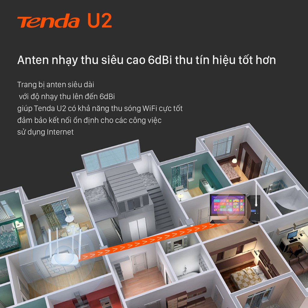 Trang bị anten siêu dài với độ nhạy thu lên đến 6dBi, giúp Tenda U2 có khả năng thu sóng WiFi cực tốt, đảm bảo kết nối ổn định cho các công việc sử dụng Internet