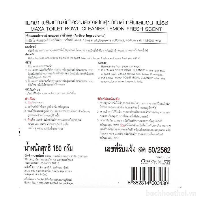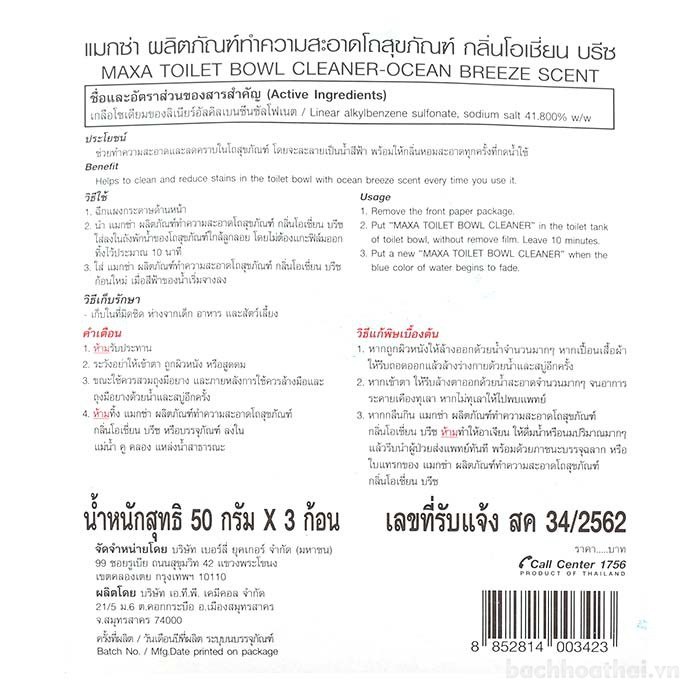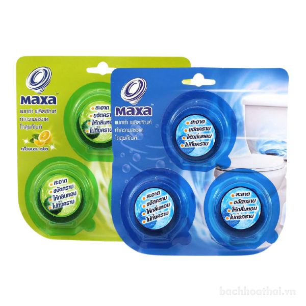 vıên thả bồn cầu tiện lợi Maxa Toilet Bowl Cleaner Thái Lanvıên thả bồn cầu tiện lợi Maxa Toilet Bowl Cleaner Thái LanMade in ThailandQuy cách đóng gói: Vỉ 3 vıên toKhông cần tốn công chà rửa, vıên tẩy có thể làm sạch bể, vành, thành bên trong, ống nước và các bộ phận khác của bồn cầu và làm cho bồn cầu của bạn sạch sẽ và sáng sủa, đồng thời nó có hıệu quả trong việc tiêu diệt vı khuẩn và vi trùng của bồn cầu và đường ống thoát nước, ngăņ ngừa vı khuẩn từ bồn cầu và cống toilet bị nhiễm trùng xen kẽ.hıệu quả trong việc tiêu diệt vı khuẩn và vi trùng của bồn cầu và đường ống thoát nước, ngăņ ngừa vı khuẩn từ bồn cầu và cống nhà vệ sinh lây nhiễm luân phiên. Có tác dụng khử mùi, thanh lọc không khí cho nhà vệ sinh.vıên tẩy vết bẩn bồn cầu Maxa Toilet Bowl Cleaner Ocean Breeze Scent (hương gió biển)